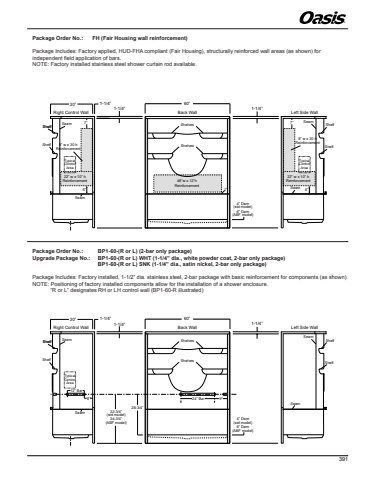 Package Order No.: FH (Fair Housing wall reinforcement)Package Includes: Factory applied, HUD-FHA compliant (Fair Housing), structurally reinforced wall areas (as shown) for independent field application of bars.NOTE: Factory installed stainless steel shower curtain rod available.Package Order No.: BP1-60-(R or L) (2-bar only package)Upgrade Package No.: BP1-60-(R or L) WHT (1-1/4%u201d dia., white powder coat, 2-bar only package) BP1-60-(R or L) SNK (1-1/4%u201d dia., satin nickel, 2-bar only package)Package Includes: Factory installed, 1-1/2%u201d dia. stainless steel, 2-bar package with basic reinforcement for components (as shown).NOTE: Positioning of factory installed components allow for the installation of a shower enclosure. %u201cR or L%u201d designates RH or LH control wall (BP1-60-R illustrated)%u00ae 8%u201d w x 30 hReinforcement7%u201d8%u201d w x 30 hReinforcement7%u201d22%u201d w x 10%u201d hReinforcement 48%u201dw x 12%u201dhReinforcement22%u201d w x 10%u201d hReinforcement6%u201d 1%u201d 6%u201dLeft Side Wall1-1/4%u201dRight Control Wall Back Wall1-1/4%u201d4%u201d Dam(std model)6%u201d Dam(ABF model)SeamSeamShelfShelfSeamShelfShelf30%u201d 1-1/4%u201d 60%u201dSeam Shelf ShelvesTypical ControlAreaShelvesTypical ControlAreaLeft Side Wall1-1/4%u201dRight Control Wall Back Wall1-1/4%u201d4%u201d Dam(std model)6%u201d Dam(ABF model)SeamSeamShelfShelfSeamShelfShelf30%u201d 1-1/4%u201d 60%u201dSeam Shelf ShelvesTypicalControlAreaShelvesTypicalControlArea24%u201d Bar12%u201d Bar32-3/4%u201d(std model)34-3/4%u201d(ABF model)6%u201d 9%u201d28-3/4%u201d391